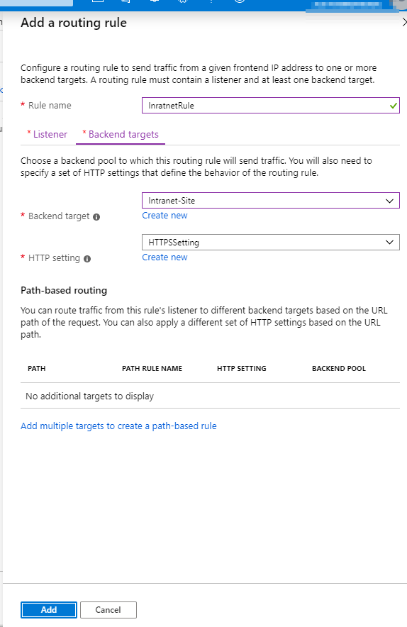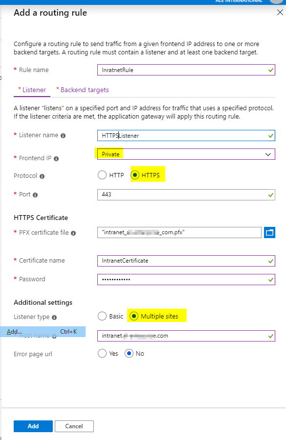 Add a rule for HTTPS , make sure to choose Private IP and Make Listener Type as Multiple sites. This is important if you’ve multisite configuration in Sitecore. We can later on implement a Listener Rule for HTTP and redirect all the HTTP requests to HTTPS.