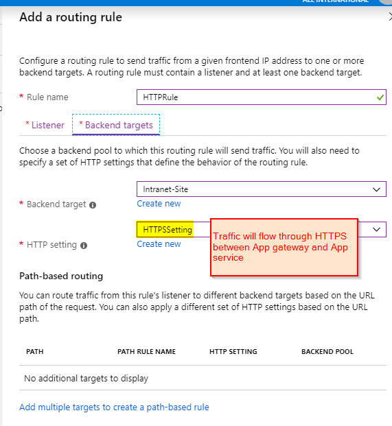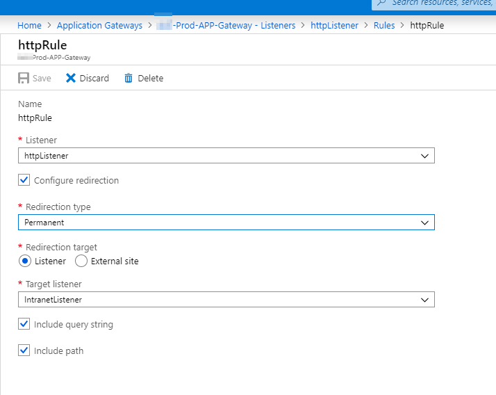 Goto HttpRule and click on Edit and then create a Redirection to IntranetListener ( HTTPSListener ). This way all the requests that are coming in from HTTP will now be redirected to HTTPS Listener.
