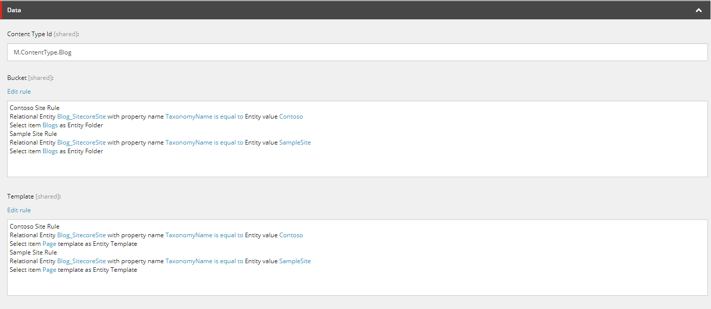 The entity mapping is done for each type of Entity that needs to be synced to Sitecore. I have two sample entity mapping created, one is for Asset which uses M.Asset type of Entity and other one is Blog which uses M.ContentType.Blog Entity. I have configured them using custom Entity rules that can be used to map template and folder based on properties within entities ex: let's say you've two different sites Contoso / Sample Site - and you have a taxonomy created in Content hub to associate content with site , then a rule can be applied to select folder based on the selected taxonomy.