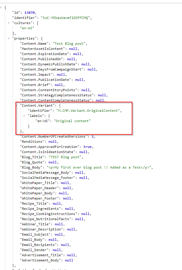 The CMP connector comes with a Field Mapping but it doesn’t really allow to map fields that are directly under properties. Let’s say you need to map out Content.Variant using it’s Label – then it is not possible as it is a property within Content Variant !