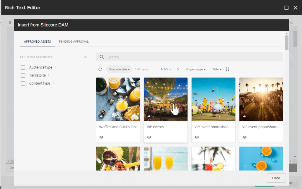 Sitecore DAM Connect : A pop-up opens up where users can search assets and select it. Upon selection, ‘Public-Link’ of asset is added to image or anchor tag based on Asset type selected.