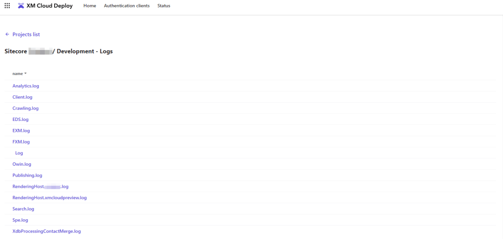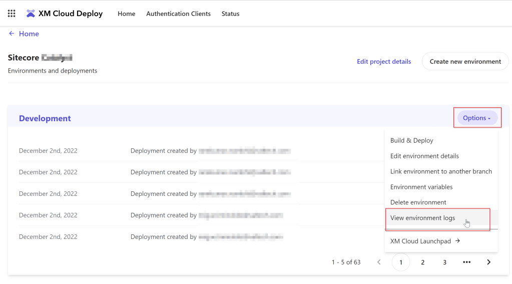 Using the portal, navigate to Environments of specific project using Manage Projects link. You would be redirected to deploy.sitecorecloud.io where you can see all the environments associated to a project. Choose options and click on ‘View Environment Logs’ for a specific environment that you would like to check the logs.
